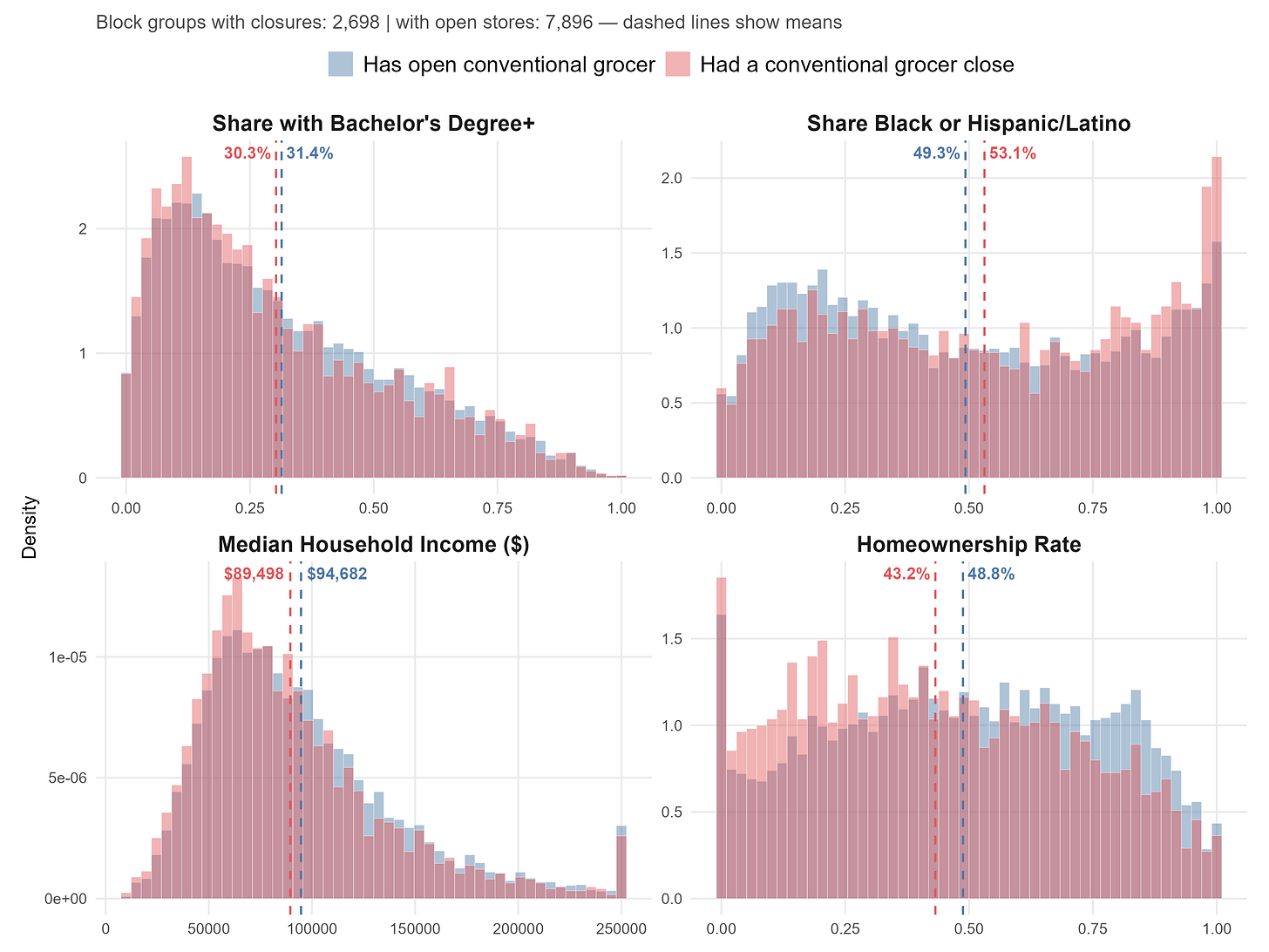A comparison of block groups where conventional stores closed against those in which there were no closures reveals broadly similar demographic distributions. However, some differences are visible in average characteristics: compared to block groups with open stores, block groups experiencing closures tend to have slightly lower median incomes, somewhat higher shares of Black and Hispanic/Latino residents, and lower homeownership rates. These differences, while not dramatic, suggest a tilt toward more vulnerable communities.