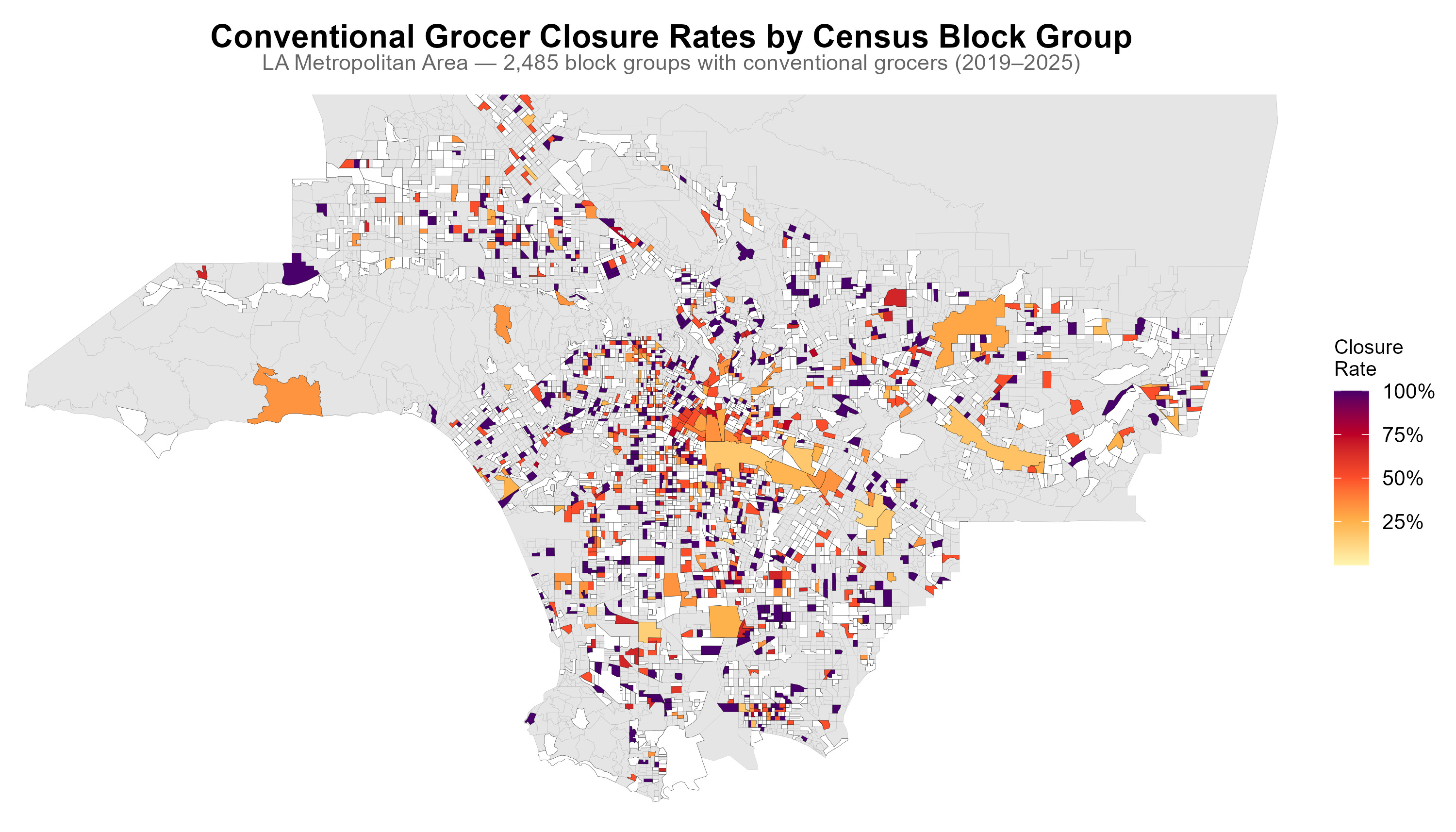 We show areas with no conventional grocery stores in gray, areas with stores and no closures over the period between 2019 and 2025 in white. Then, block groups experiencing closures are color-coded, with a darker color corresponding to higher closure rates (closed stores divided by closed plus open stores as of 2025). We can see that many block groups experiencing closures lose all or more than half of their stores, and that closures cluster across neighboring block groups, especially close to downtown Los Angeles, in the East, and in the South.