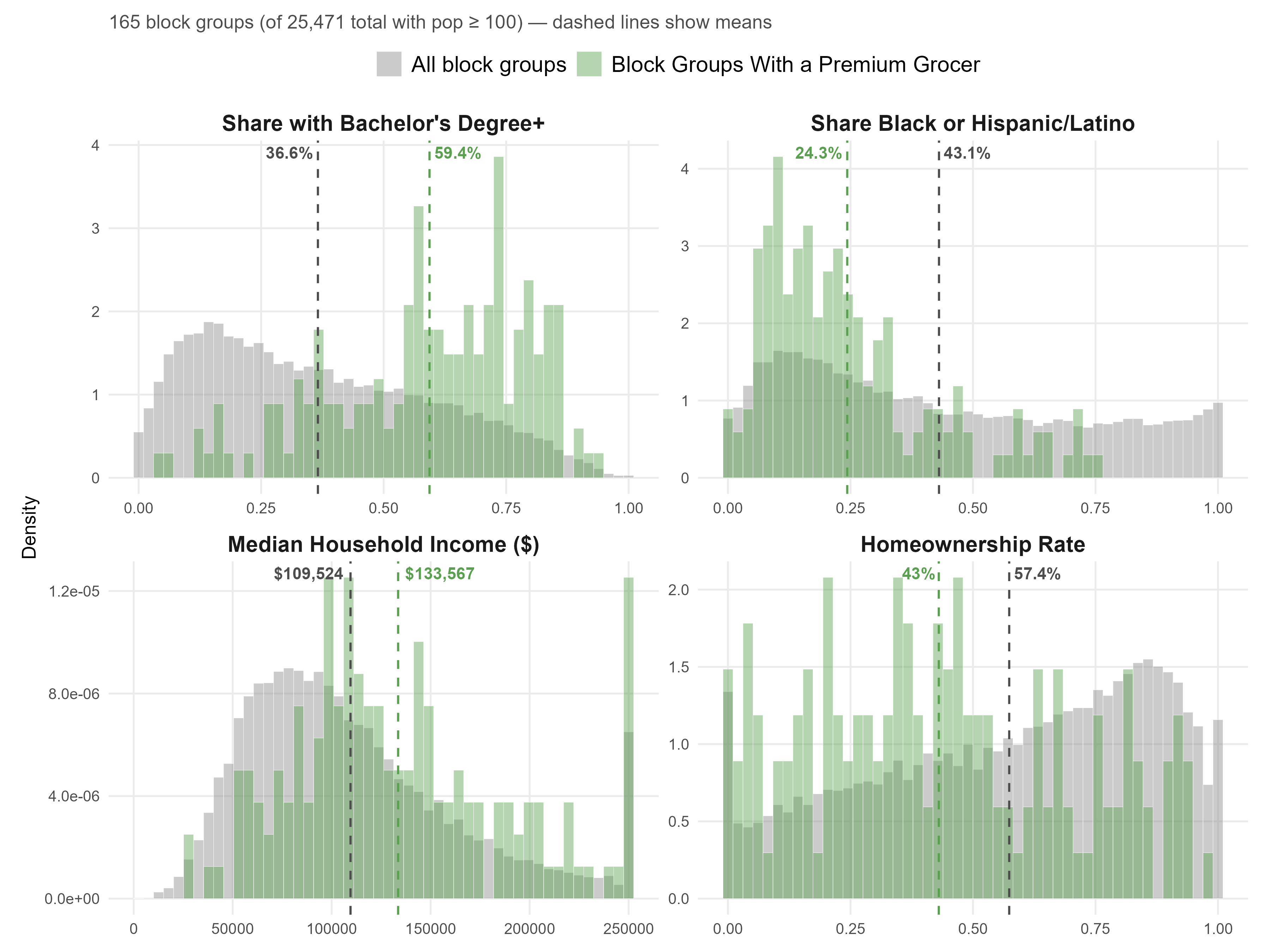 Relative to state-wide averages across block groups, the locations with premium grocers have substantially higher shares of college-educated adults (on average, 59.4 p.p. vs 36.6 p.p), lower shares of Black and Hispanic/Latino residents (on average, 24.3 p.p. vs 43.1 p.p.), and elevated median household incomes (on average, $133.5k vs $109.5k). However, they also have substantially lower homeownership rates, about 43 p.p. on average, compared to the overall average of 57.4 p.p..