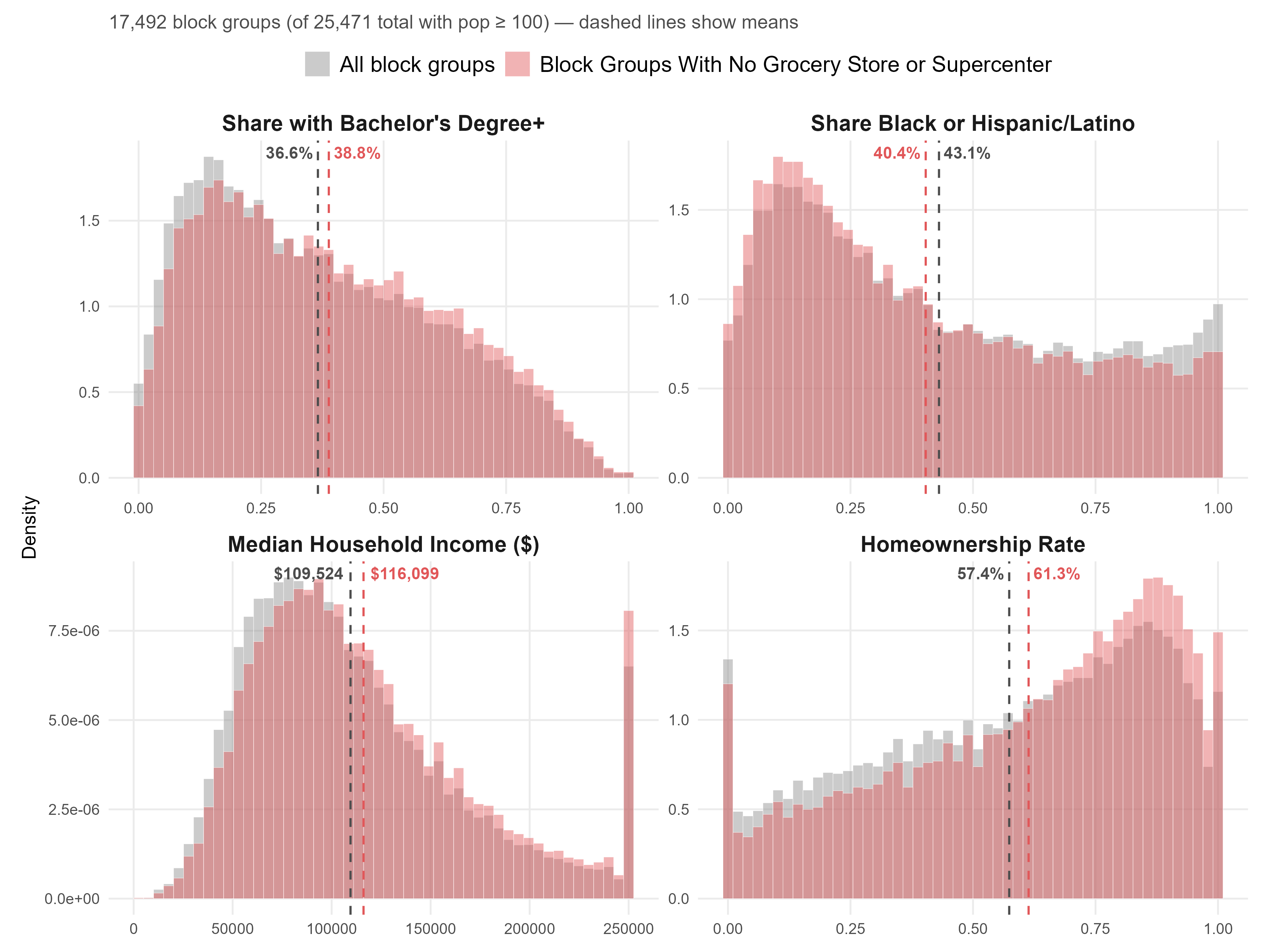 Notably, 68.7% of California’s block groups contain no grocery store or supercenter at all. These neighborhoods in principle include lower-density areas at the outskirts of major population centers. However, in the figure below, we find that these block groups without grocery stores have a distribution of demographic characteristics similar to the overall population; if anything, they have slightly higher education and income, a lower Black and Hispanic/Latino share, and a higher homeownership rate. Thus, residential neighborhoods are likely to make up a substantial portion of these areas.
