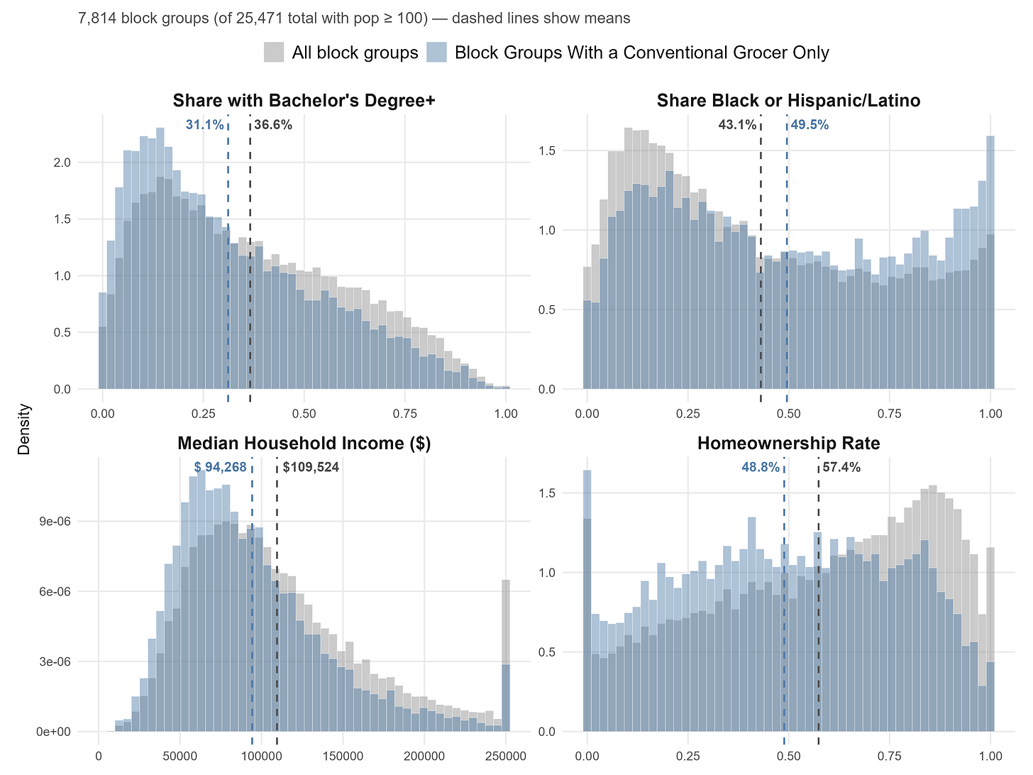 We can see below that conventional stores, by contrast, are located in block groups with a distribution of demographic characteristics more similar to the overall population of block groups, but with on average a lower share of bachelor educated adults (31.1 p.p., on average), lower incomes ($94.2k), a higher share of Black or Hispanic/Latino residents (49.5 p.p.), and lower homeownership rates (48.8 p.p.).