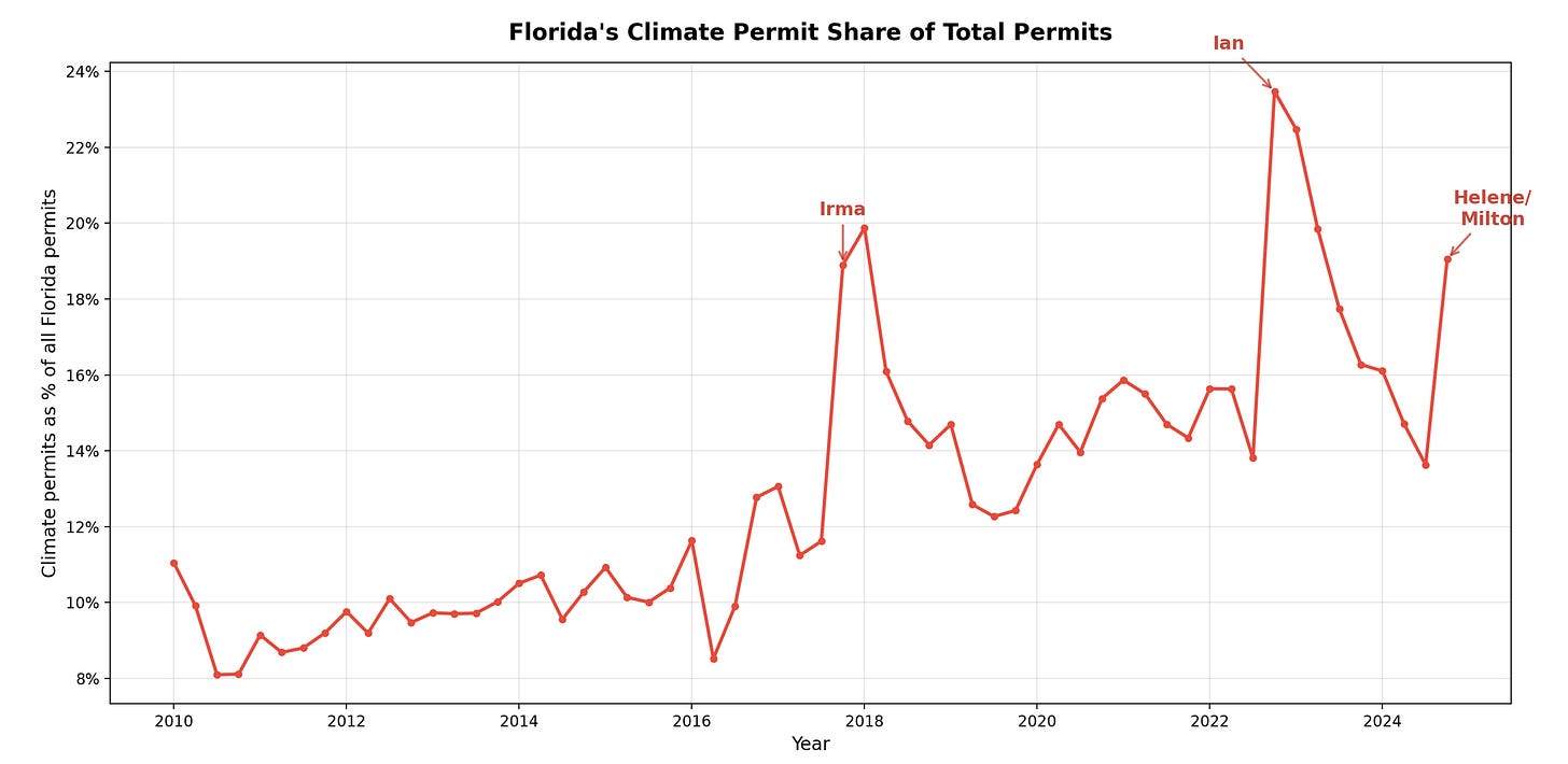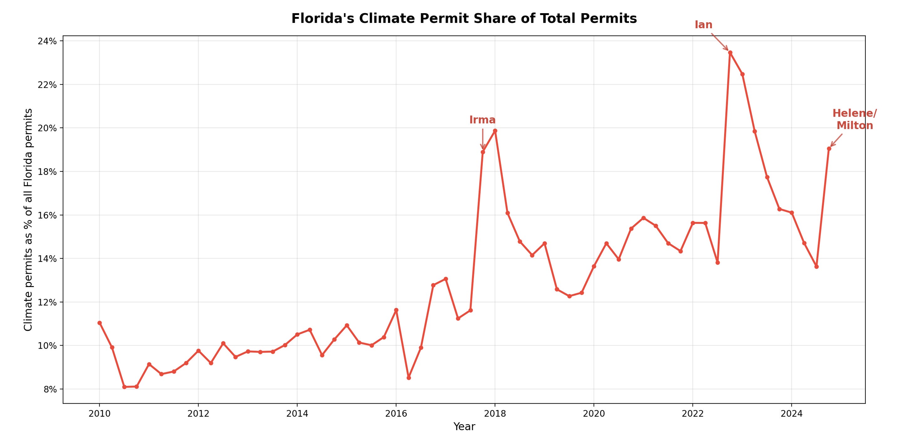 The figure below shows that the fingerprints of major hurricanes are clearly visible. Florida's climate permit share hovers around 8-10% through the early 2010s. Then Irma makes landfall in September 2017, and the share nearly doubles in a single quarter, from 12% to 19%. Ian repeats the pattern even more dramatically in late 2022, driving the share from 14% to 24%. Helene and Milton push it back to 19% in late 2024. Interestingly, between storms the share never fully retreats to pre-Irma levels, settling into a new baseline of 13-16%.