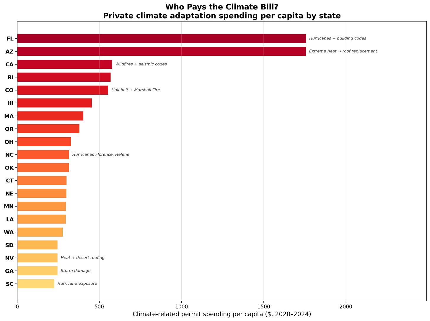 Florida is in a league of its own. Between 2020 and 2024, spending on climate-related building permits totaled $1,750 per person. This is more than triple the next-highest state. Florida’s exposure to Irma (2017), Michael (2018), Ian (2022), and Helene and Milton (2024), combined with one of the nation’s strictest wind-resistance building codes, means every roof replacement must now meet hurricane-rated standards. Each repair is therefore more expensive, but also more protective.