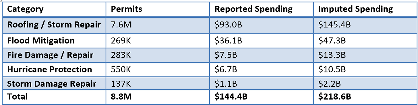 Roofing dominates the total, accounting for 67% of all spending. This is not surprising: roof replacement is both the most common home repair triggered by weather events and the most frequently permitted type of work.
