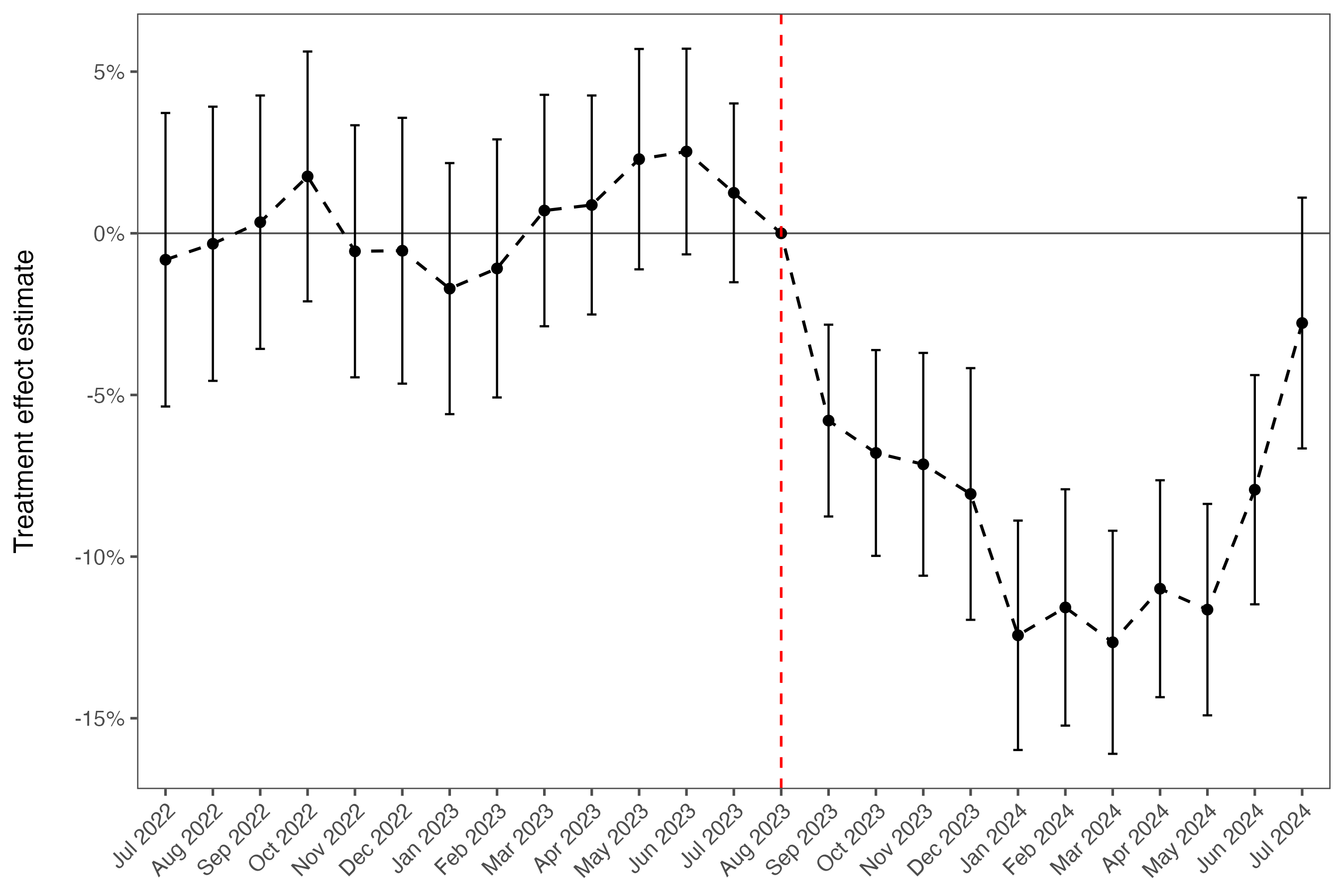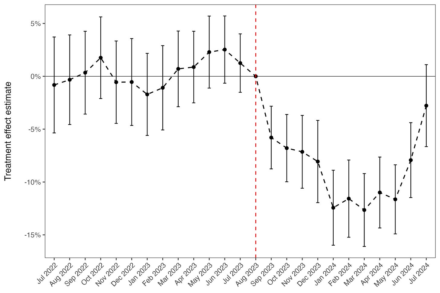 The results are striking: following the implementation of the regulation, restaurant spending in New York City declined by approximately 10% on average relative to the control group. The figure below plots the monthly changes in restaurant spending for New York City restaurants compared with their matched controls during the year preceding and following the policy’s implementation (the red dashed line indicates the month immediately preceding the policy's effect).